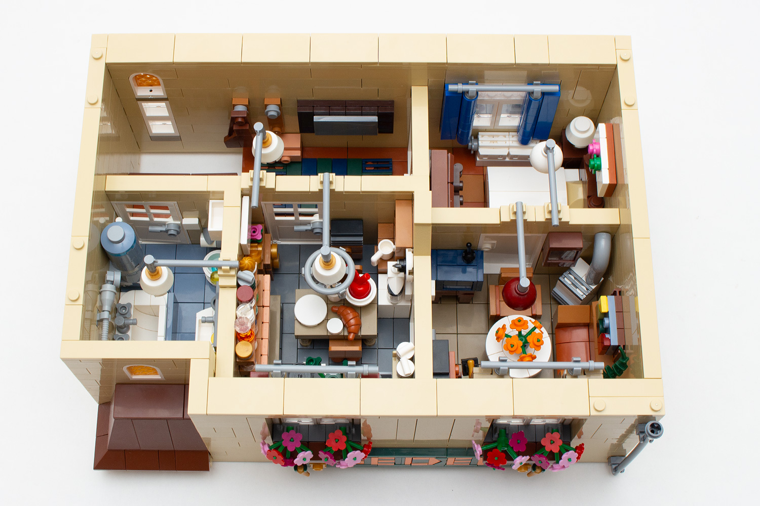 Nach der Fertigstellung der Mauern werden die Fenster sowie die Vorhänge angebracht und die Deckenleuchten setzen den Abschluss des Baus dieser Etage. Auf einer Fläche von 20 × 32 Noppen verteilen sich nun ein Badezimmer mit Toilette, eine Küche, ein Wohnzimmer sowie ein Arbeitszimmer – alles sehr detailreich eingerichtet, sodass kaum eine freie Stelle bleibt.