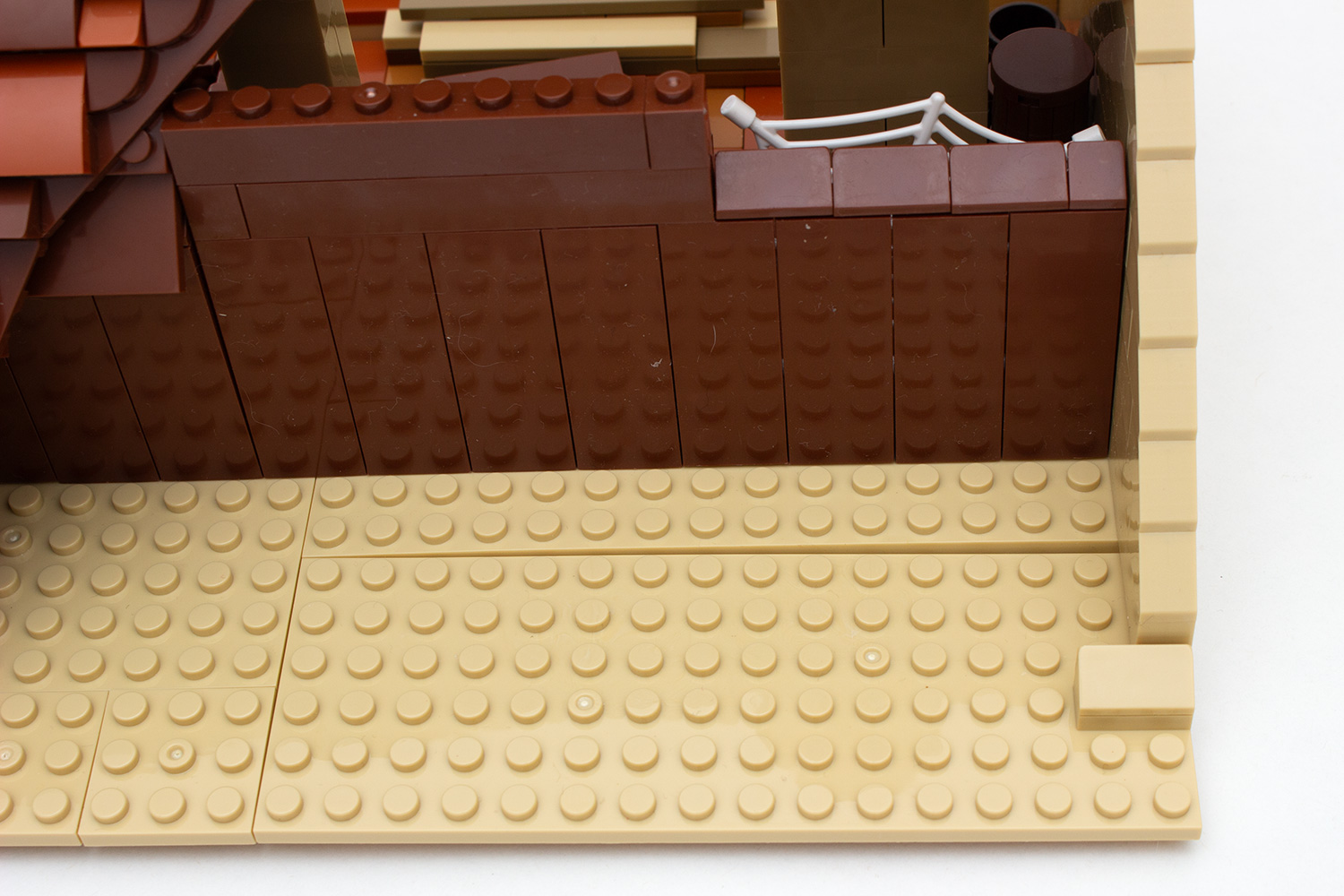 Schließlich wird mit dem Bau der Mauern begonnen. An der Front des Gebäudes wird diese zunächst mit sandfarbenen Steinen begonnen, für den Sockel werden zudem mehrere 2/3 hohe Brick Modified mit Noppen an den Seiten davor gesetzt. Auf diese werden im Anschluss zwei 2 × 12er Platten in Dark Tan sowie gleichfarbige Fliesen angebracht. Das Anbringen gestaltet sich jedoch schwierig, da auf der Innenseite direkt der große Tisch und andere Einrichtungsgegenstände stehen, was das Ausüben von Gegendruck beim Aufklemmen erschwert. Hier sind stabile Fingernägel gefragt.