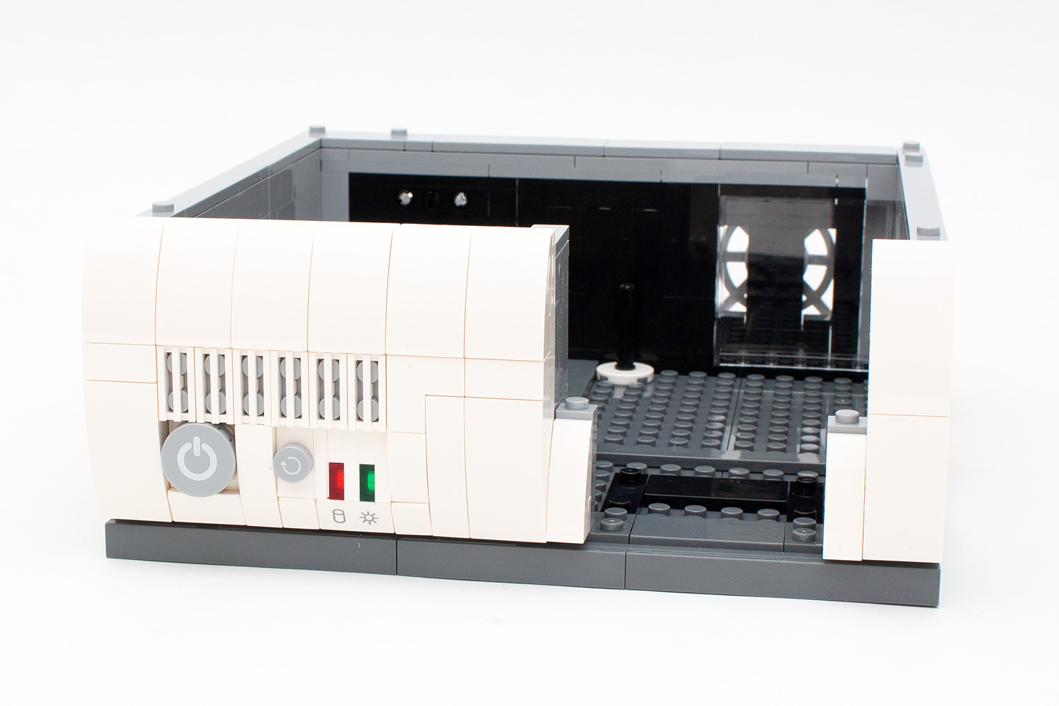 Im zweiten Bauabschnitt werden die Seitenwände des Gehäuses gebaut, auf die später die Abdeckung aufgesetzt wird. Sobald dies abgeschlossen ist, beginnt der Baumeister mit dem Bau der Front samt erster Bedienelementen, wie dem Einschalt- und Reset-Knopf, die durch eine bedruckte 2 × 2 beziehungsweise 1 × 1 Rundfliese dargestellt werden. Außerdem werden die Power-LED und die Statusleuchte für die Festplatte mit eingebaut. Nach diesen beiden Abschnitten dürfte der Baumeister bereits etwa eine Stunde investiert haben.