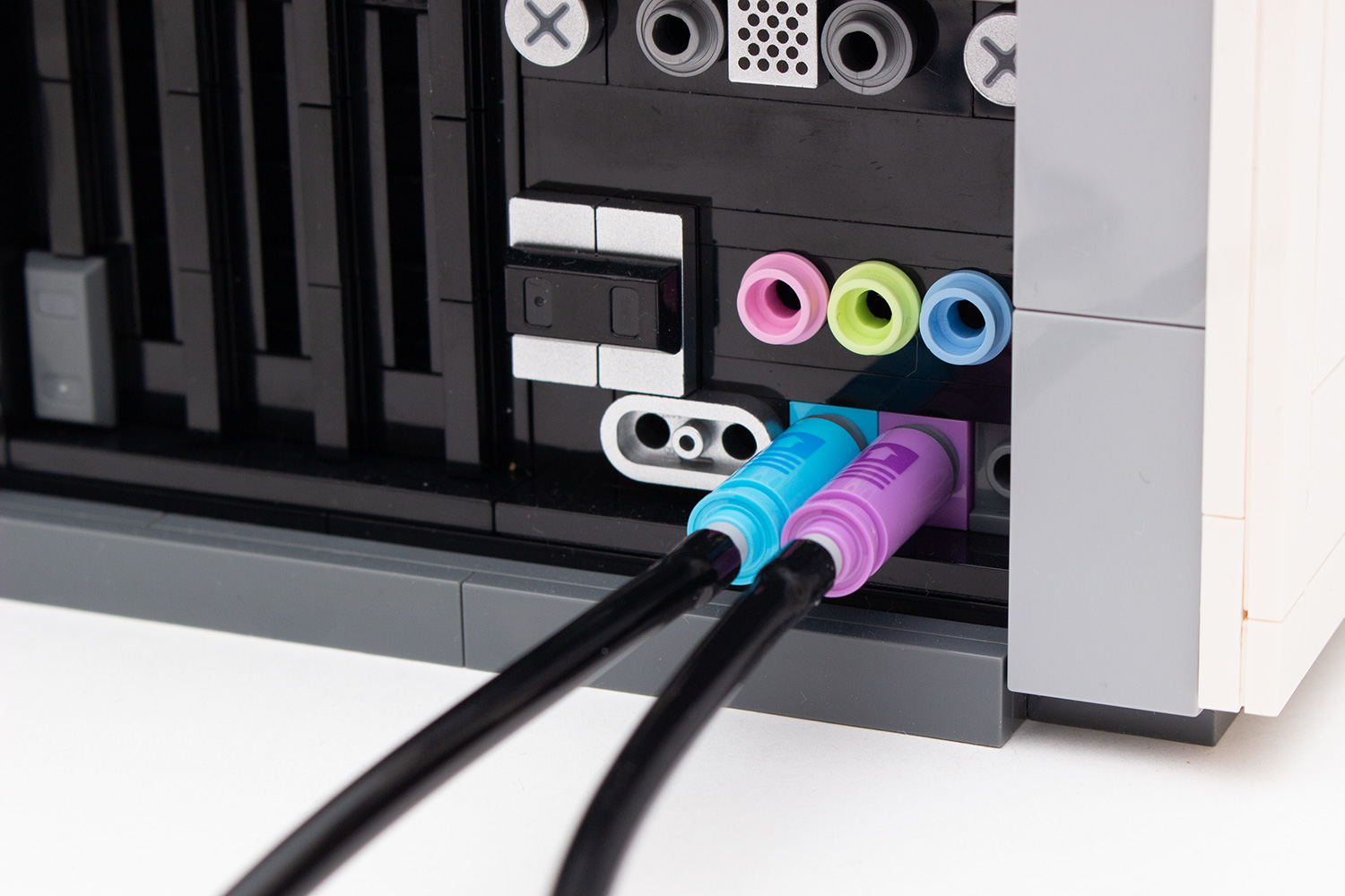 In den abschließenden Bauabschnitten werden die Peripheriegeräte einschließlich der dazugehörigen Kabelage gestaltet. Das analoge Monitorkabel wird aus verschiedenen Steinen gefertigt und ist dabei komplett in blau gehalten – ein nostalgischer Verweis auf die Zeit vor HDMI und der breiten Verfügbarkeit von DVI. Als Kabel fungiert hierbei ein schwarzer Schlauch. Im Gegensatz zu den Originalen müssen diese allerdings nur eingesteckt anstatt festgeschraubt werden. Dennoch ist hier Vorsicht geboten, denn ein ungenauer Sitz oder übermäßiger Druck kann dazu führen, dass das Segment sich löst und ins Innere des Monitors fällt.