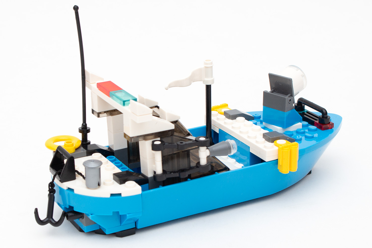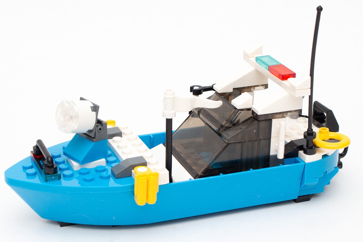 Der Aufbau beginnt mit dem großen Polizeiboot, dessen Rumpf größtenteils aus Formteilen besteht. Auch der restliche Aufbau stellt keine besondere Herausforderung dar, sodass selbst jüngere Baumeister kaum Schwierigkeiten haben dürften – mit einer Ausnahme: Die mitgelieferte Schnur, an der der Anker befestigt wird, lässt sich nur schwer um den Pfahl im Heck des Bootes binden, da sie sich immer wieder abrollt. Eine einfachere Lösung besteht darin, die Schnur auf eine Noppe zu legen und durch das Aufklemmen des Pfahls zu fixieren.