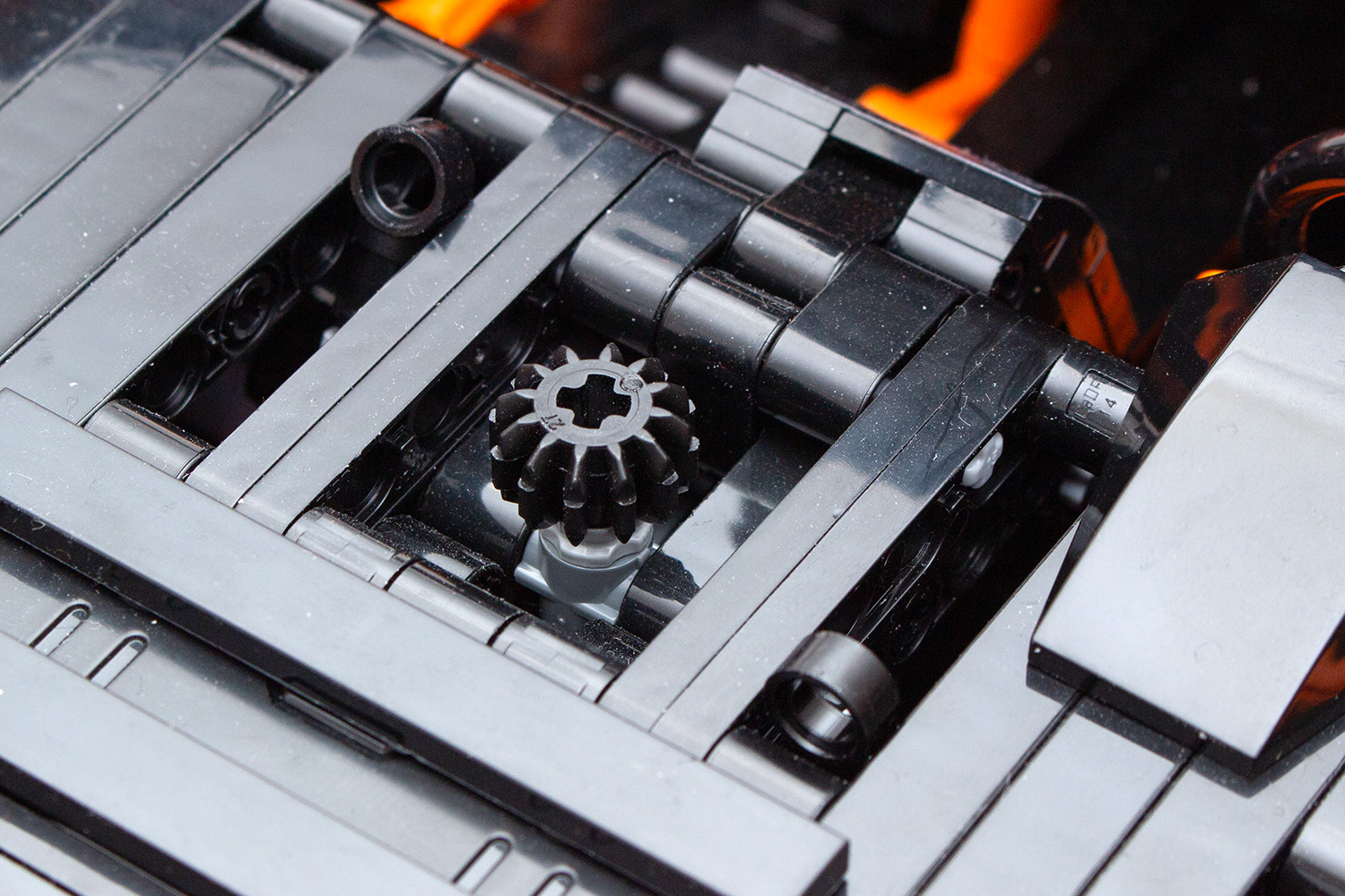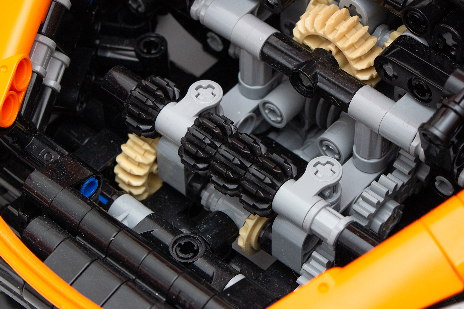 Die gleiche Zeit wird der Baumeister anschließend mit dem über acht Gänge verfügenden Getriebe sowie dem Motor und einem Teil des Innenraums verbringen. Auch wenn das Getriebe räumlich lediglich einen kleineren Teil des Modells einnimmt, wird dennoch ein erheblicher Teil des zweiten Bauabschnitts auf diesen Bereich entfallen.