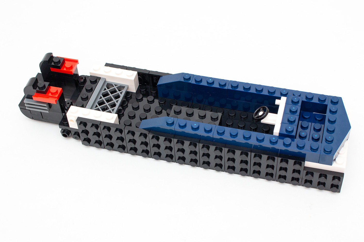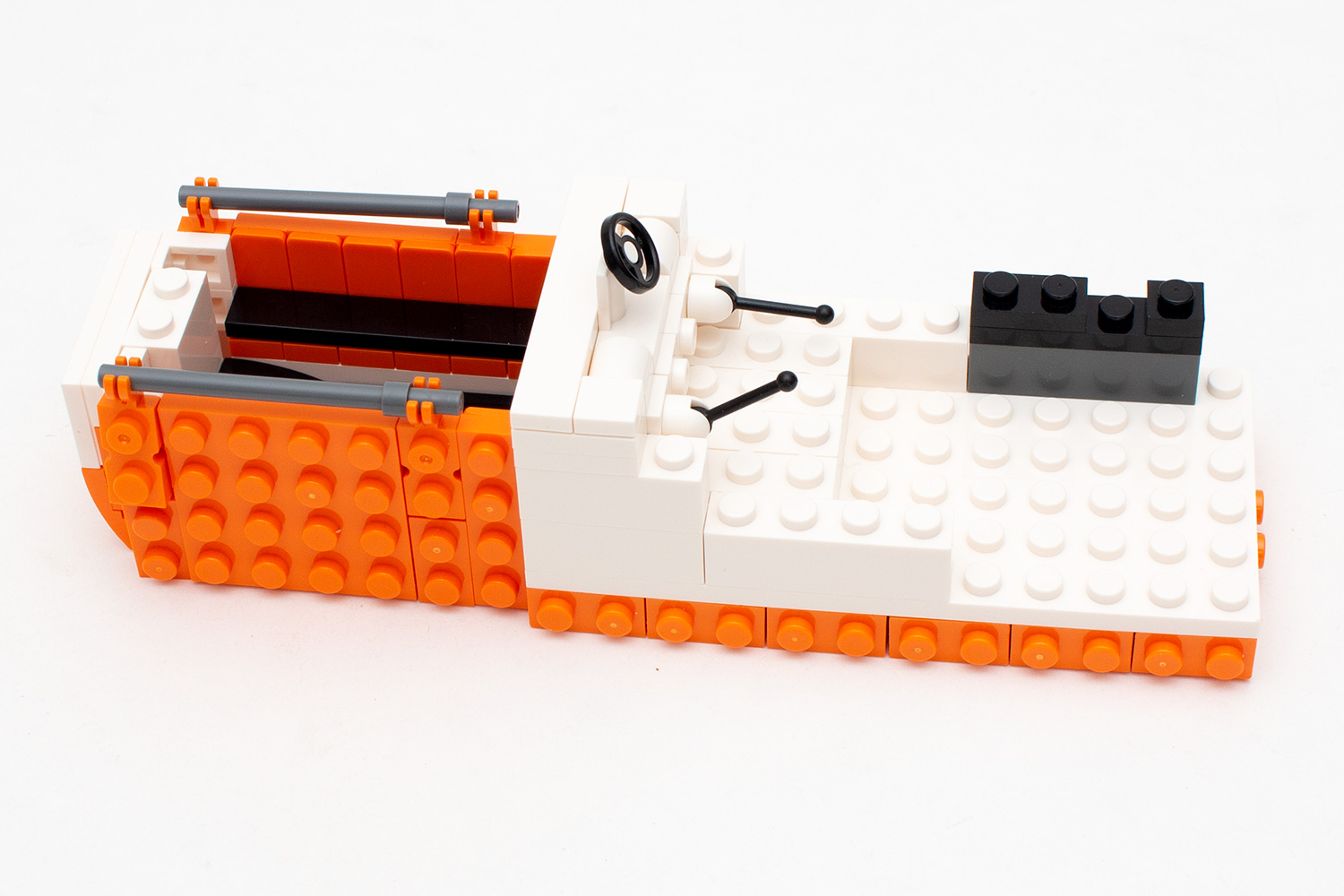 Auffällig ist, dass bei allen drei Modellen der Schiffsrumpf nicht aus Formteilen, sondern vollständig aus herkömmlichen Steinen aufgebaut wird. Besonders das Polizeiboot und der Fischkutter fallen dadurch auf, dass Mould King hier bereits im unteren Bereich verschiedene Bricks Modified mit seitlichen Noppen verwendet. Dadurch entsteht allerdings auch eine gewisse Grundspannung innerhalb der Rümpfe, die jedoch keine nennenswerten Auswirkungen auf Stabilität oder Aufbau hat.