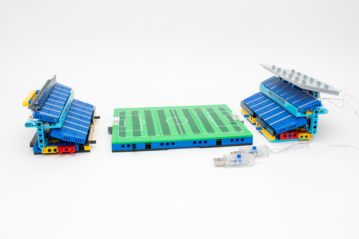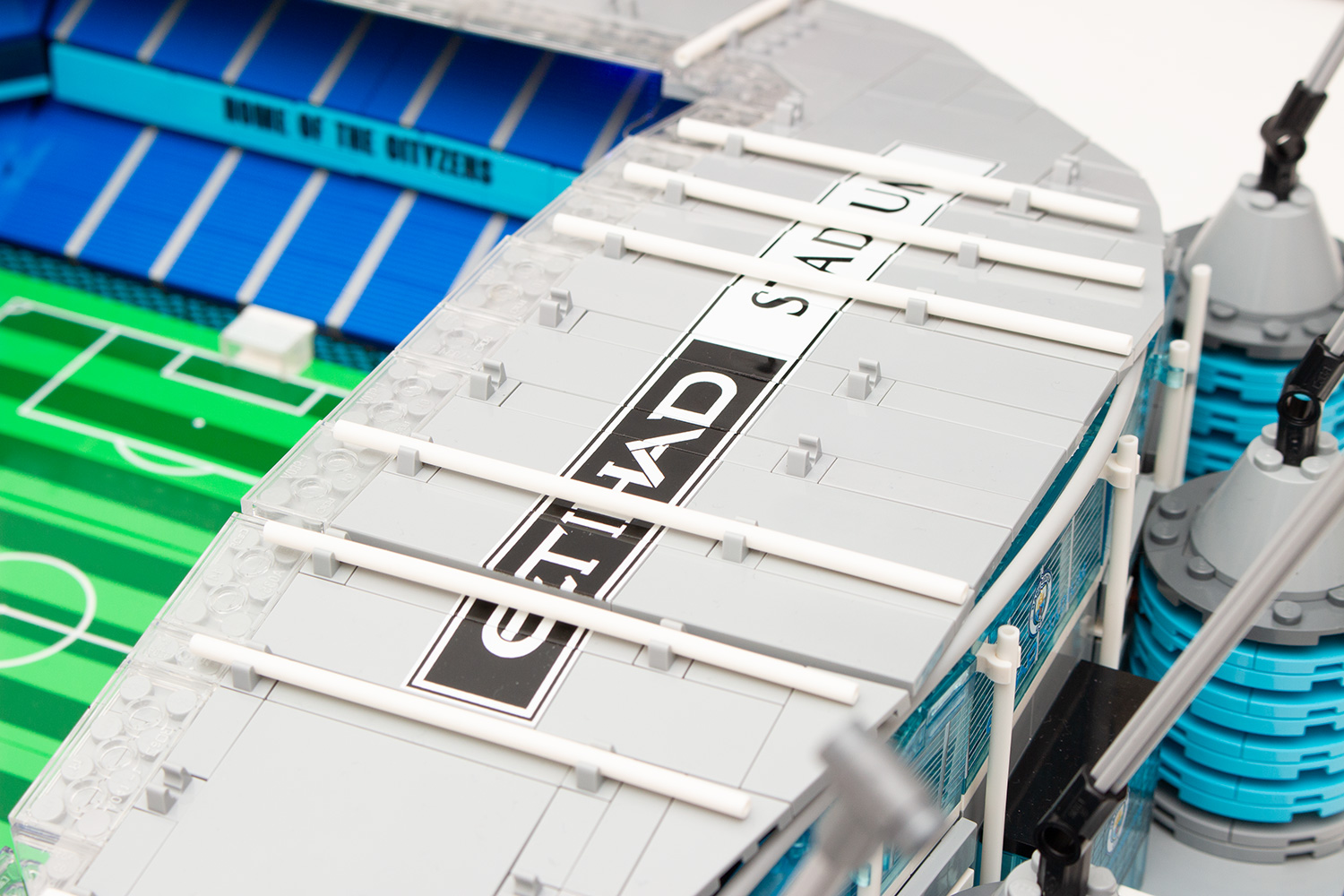 Sobald der Rasenplatz mit den vier Tribünen umschlossen ist, wird das Dach gebaut, welches ebenfalls aus vier Modulen besteht. Da dieses im Original gewölbt ist, bestehen die Dächer aus einzelnen Lamellen, welche untereinander mit Kugelelementen verbunden sind und somit entsprechend abgeknickt werden können. Die Befliesung des Daches ist dabei recht aufwendig bedruckt. An Stellen, wo das Original aus einer durchsichtigen Glasschicht besteht, werden entsprechend Fliesen in Trans-Clear verbaut, was jedoch aufgrund der darunter liegenden Platten in Light-Bluish-Grey nicht vollumfänglich wie eine Glasschicht wirkt.