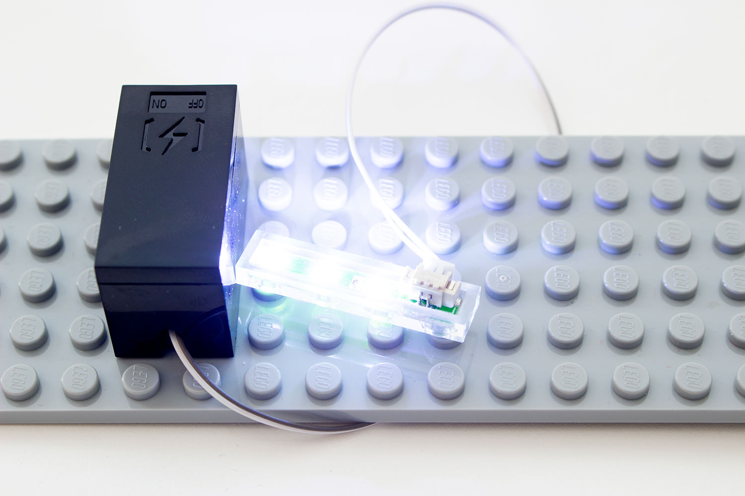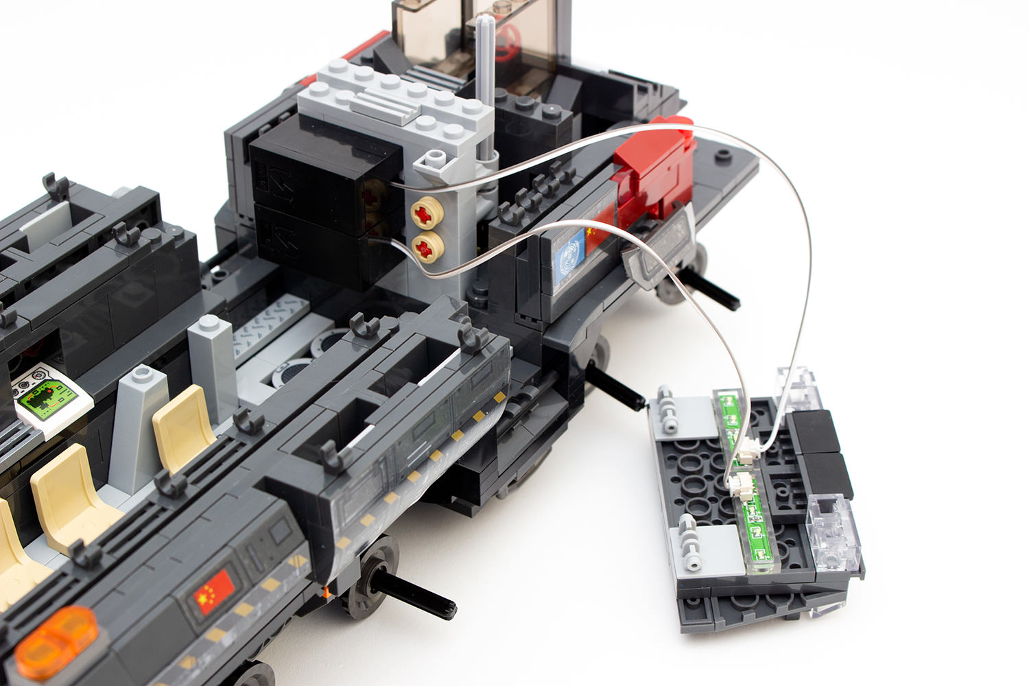 Darüber hinaus beinhaltet das Modell zwei 1×4 Noppen große LED-Plates, welche auf der Verpackung nicht sofort als solche zu erkennen sind. Die dazugehörigen Batterieboxen sind wiederum mit 2×4 Noppen in der Größe eines klassischen Bricks gehalten und mit 3 Knopfzellen gefüllt. Verbunden sind beide Einheiten über ein fest angebrachtes 20 cm langes Kabel. Da die LED-Leuchten einen gewissen Platz für sich beanspruchen, können diese nur unterbaut werden, was die Verwendbarkeit ein wenig einschränkt.
