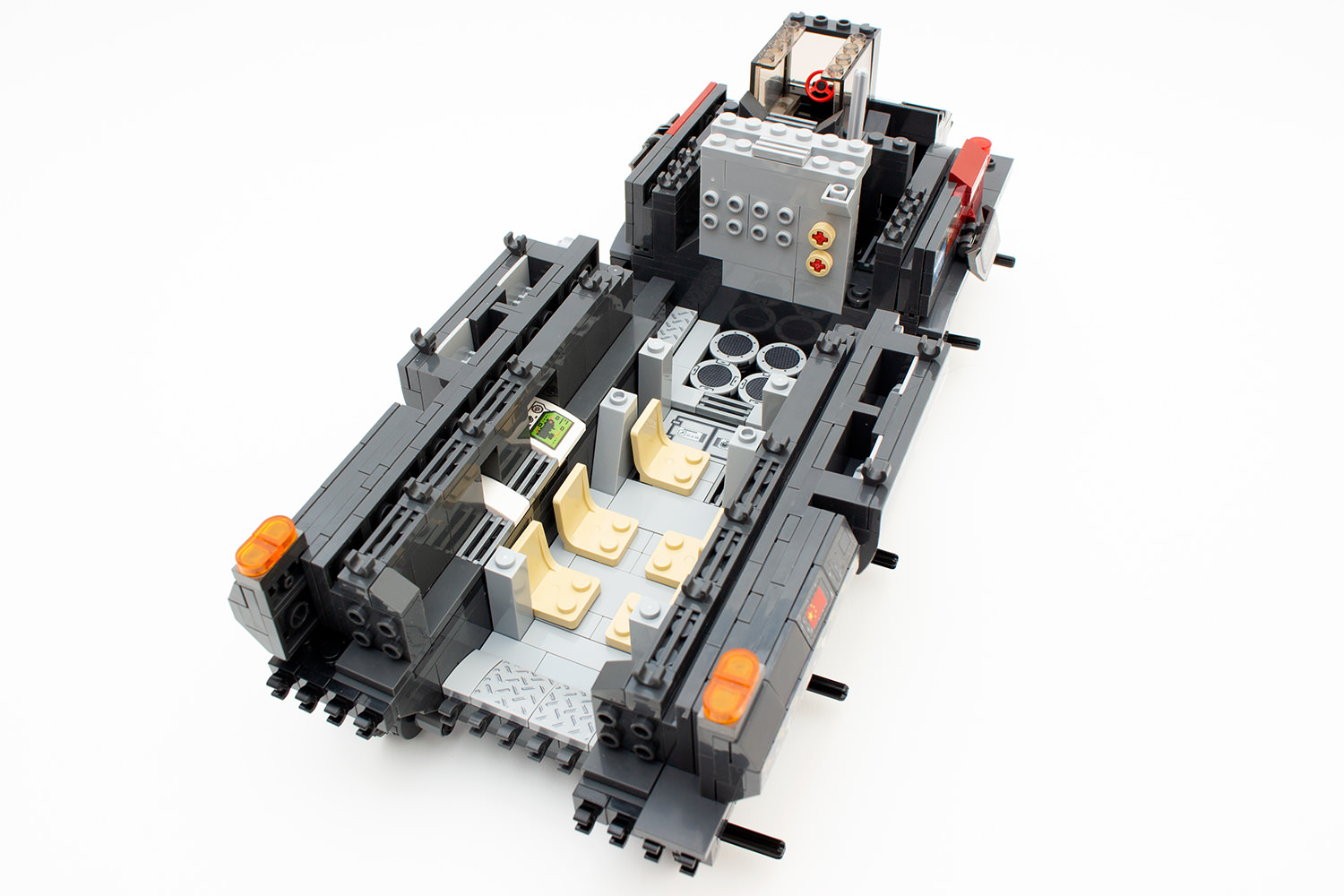 Dies ist aber nicht die letzte Unzulänglichkeit des Modells: Als weitere Verkleidungen und die seitlichen Luken eingebaut sind, wird schnell deutlich, dass die Beleuchtung der Frontscheinwerfer nicht so ohne weiteres eingeschaltet werden kann. Dies beruht unter anderem darauf, daß die beiden 2×4 Noppen großen Batteriekästen lediglich mit 1×4 Noppen seitlich an die Trennwand zum Führerhaus „gehängt“ werden. Selbst ein vorsichtiges Betätigen des Schalters am unteren Kasten sorgt dafür, dass dieser sehr leicht abfällt. An den Schalter des darüber angebrachten Kastens kann erst gar nicht herangekommen werden, da dieser viel zu weit oben befestigt ist. Zwischen der Außenwand und dem Schalter ist ein Spalt von gerade mal einer Noppe Breite vorhanden, in welche kein Finger passt. Ebenfalls ein klarer Design-Fehler. Beim fertigen Modell besitzen die Scheinwerfer zudem nur einen geringen Effekt, so hell leuchten die LED-Steine am Ende auch nicht.