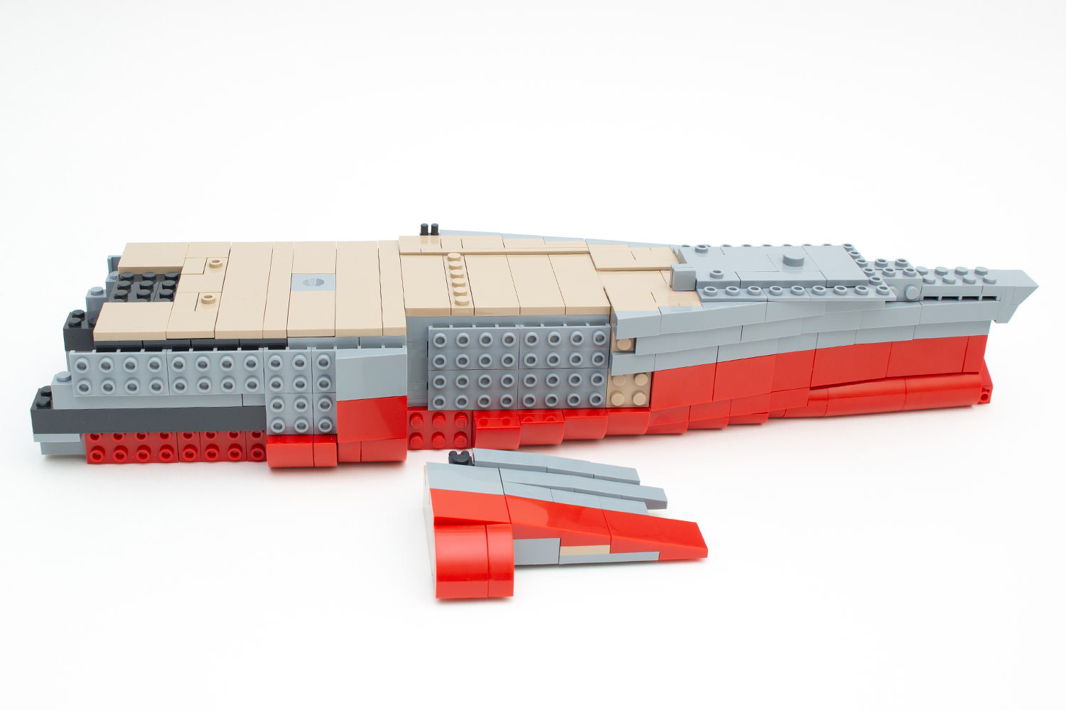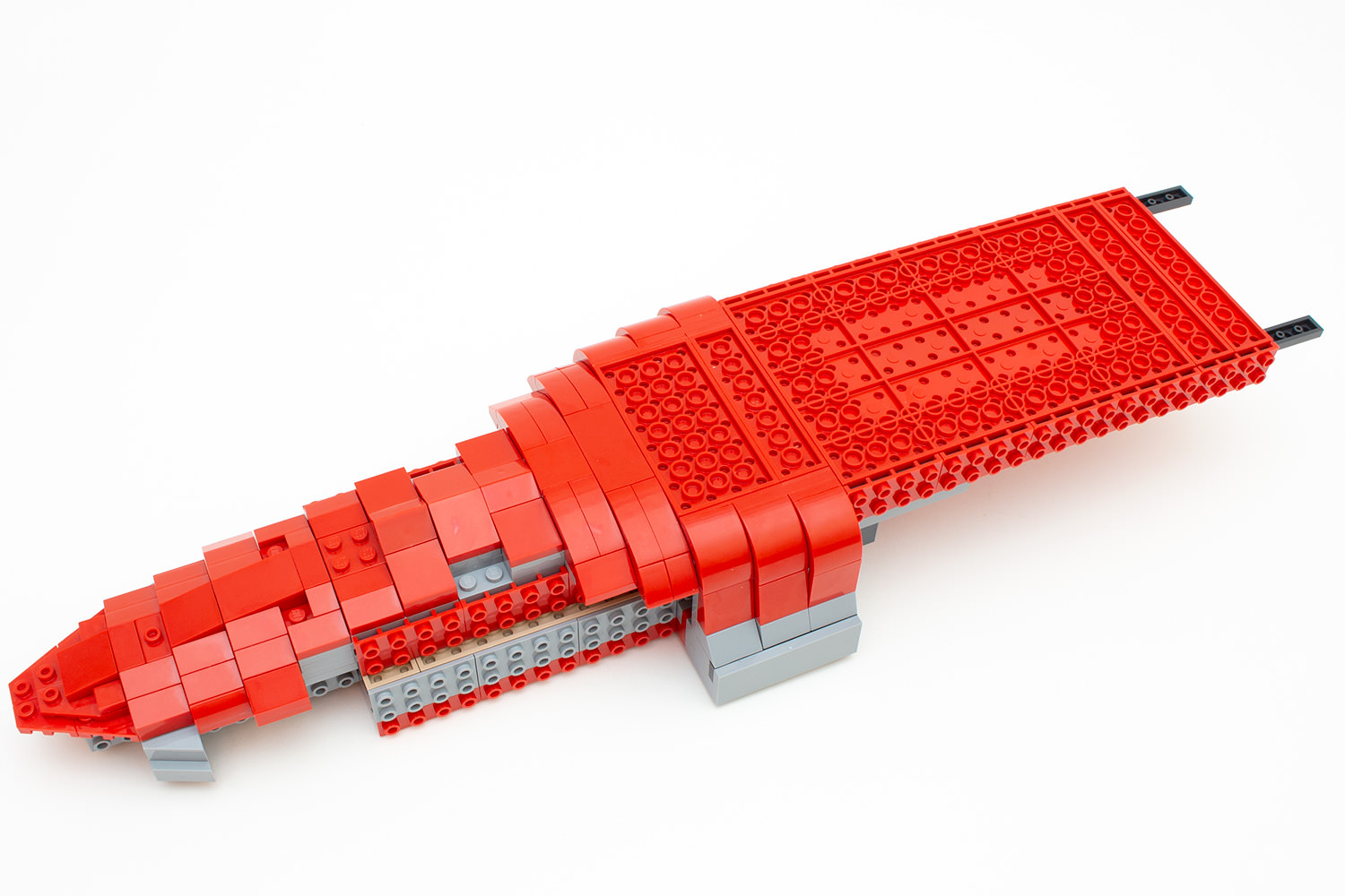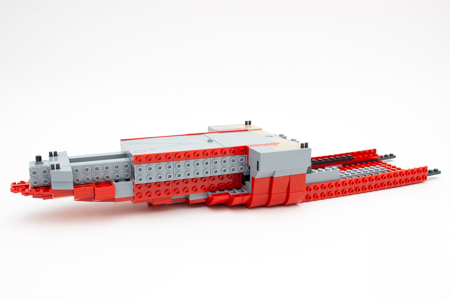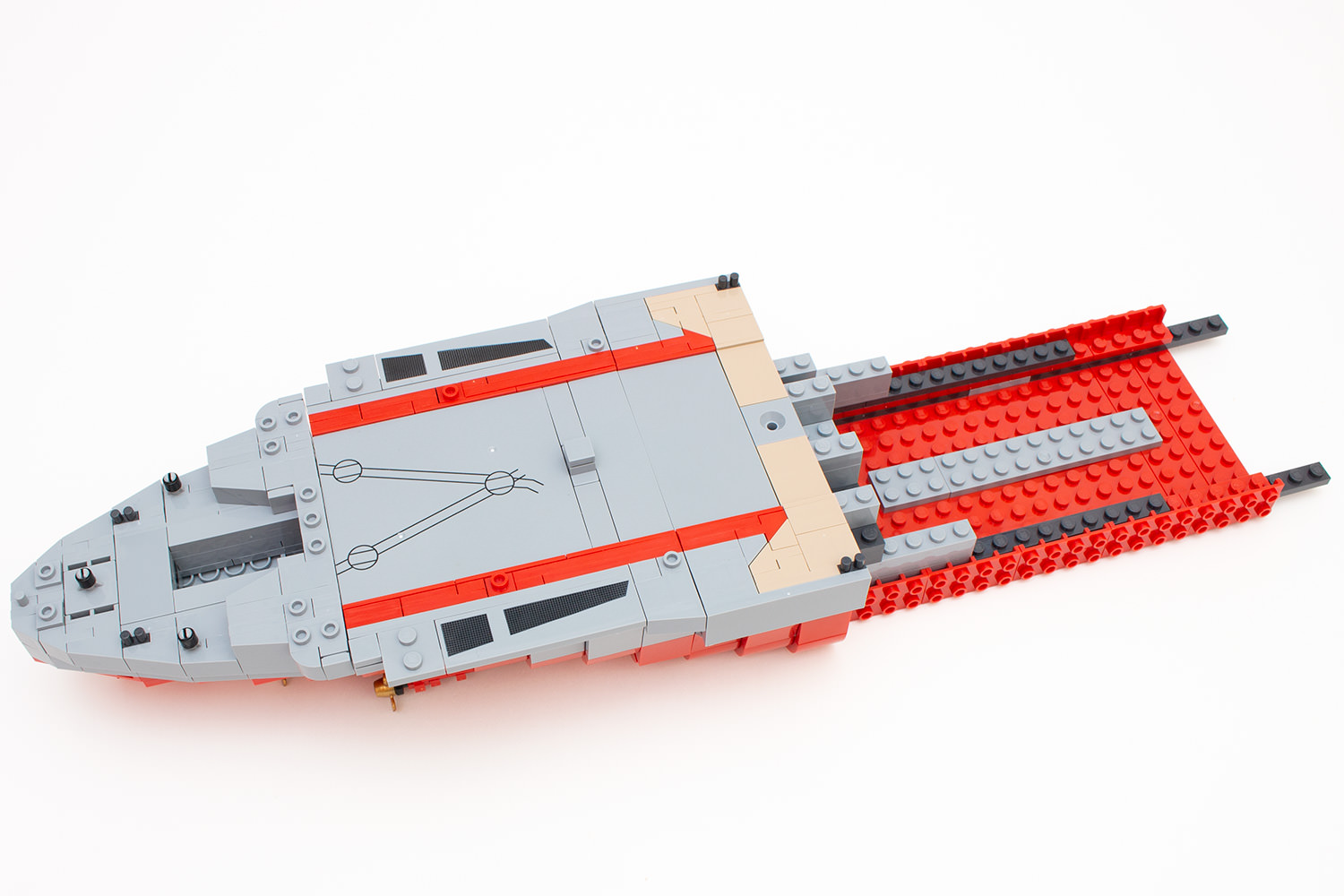 Im Verhältnis zur Rumpfgröße nimmt der restliche Aufbau des deutlich kleineren Oberbaus mit rund drei Stunden mehr Zeit in Anspruch. Auch geht es an dieser Stelle gefühlt deutlich langsamer voran als beim restlichen Modell, da hauptsächlich kleine Teile verbaut werden. Zu diesem Zeitpunkt kommen auch zum ersten Mal in großer Zahl die beigelegten Prints zum Einsatz, bei deren Einbau auf die richtige Ausrichtung geachtet werden muss. Zudem muss ständig genau in die Anleitung geschaut werden, da sich sonst schnell verbaut werden kann.