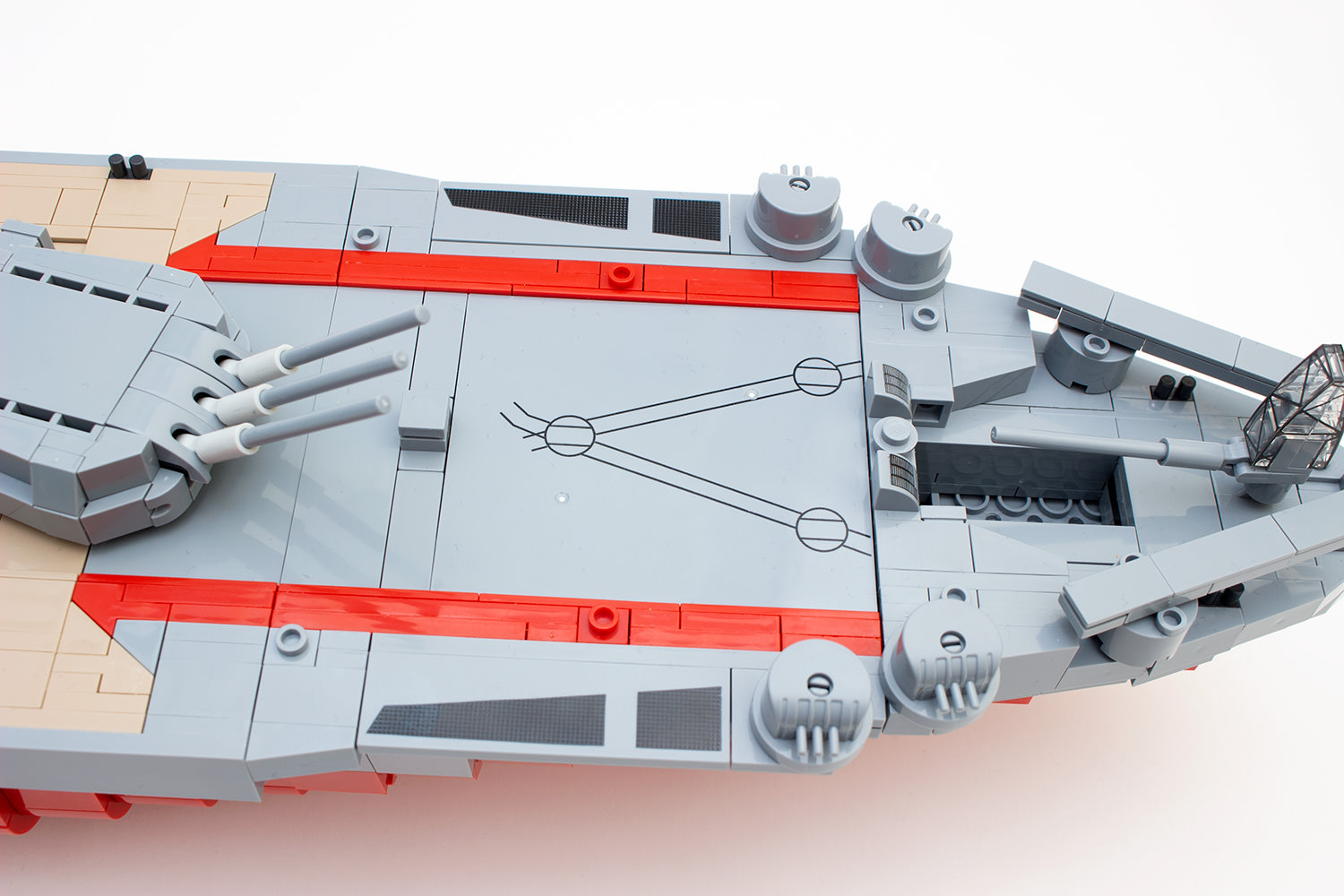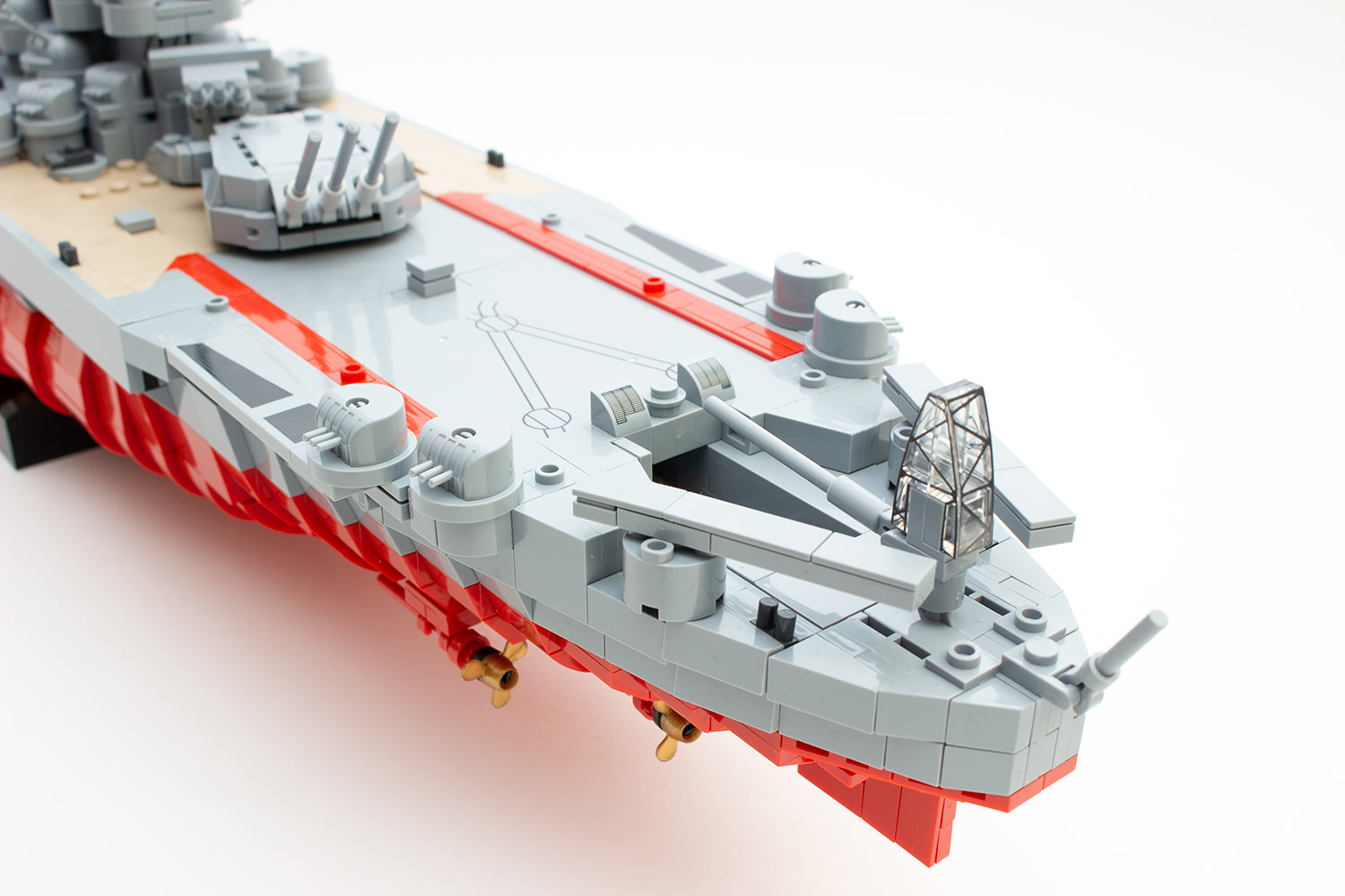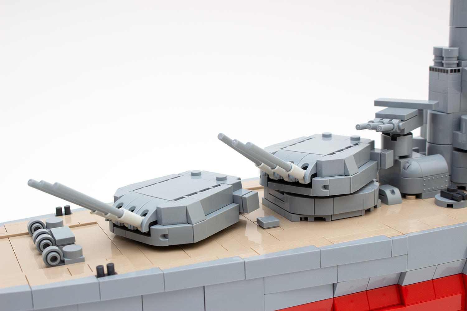Die kleineren Geschütze werden bei dem Set größtenteils aus Formteilen gefertigt. Lediglich die drei großen Drillingstürme der Baureihe 40cm/45 Typ 94, welche das schwerste jemals auf einem Kriegsschiff real verwendete Geschütz darstellen, werden aus einzelnen Teilen gefertigt, sind dafür aber um so imposanter.
